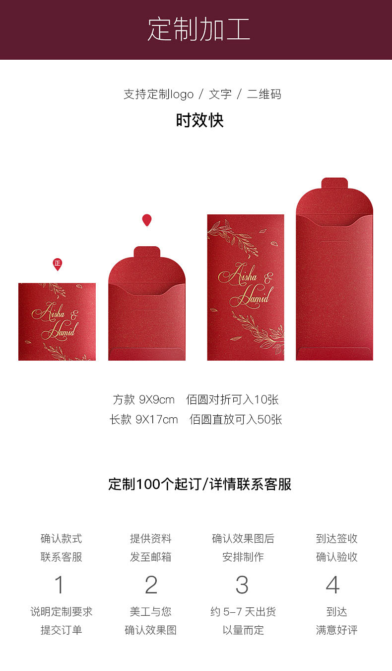 我们提供专业的批量定制服务,根据您的婚礼主题和个人喜好,可进行个性化设计。不同起订量满足不同需求,让您的婚礼红包独一无二,成为宾客珍藏的美好回忆。