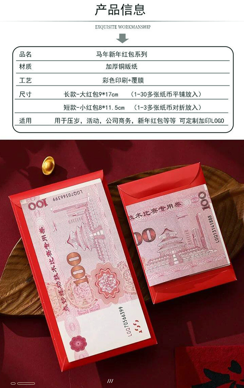 每一个红包都经过严格的质量检验,从设计到印刷,从选材到包装,每个环节都精益求精。磨砂工艺防指纹,UV印刷不掉色,金葱纸内页闪亮持久,让您买得放心,送得开心。