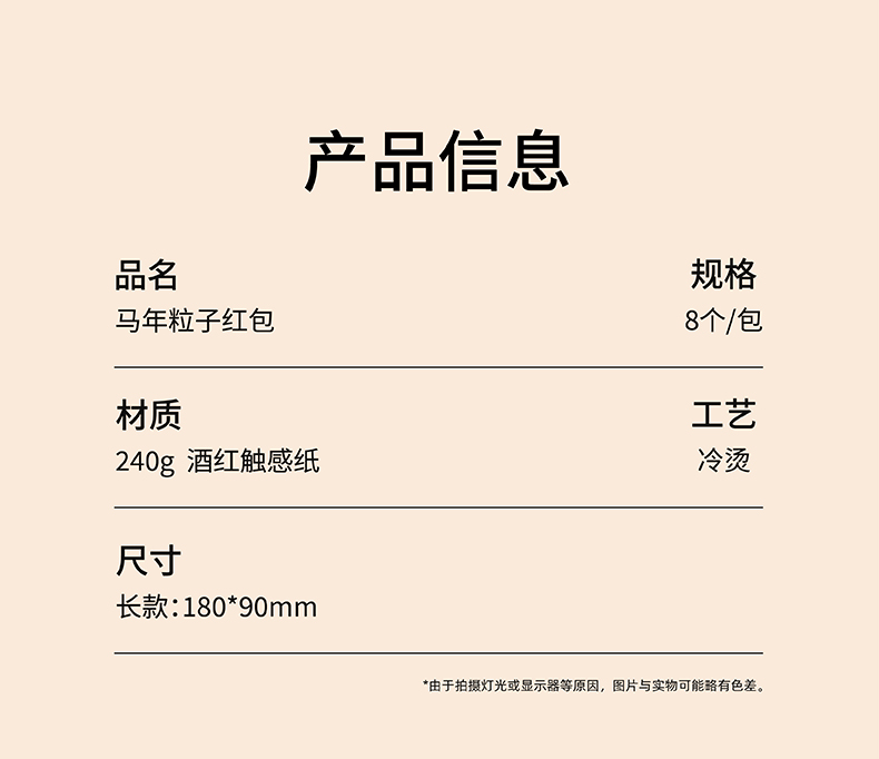 每包包含8个红包,数量适中,满足您春节期间给家人、朋友、孩子派发红包的需求。”8″谐音”发”,更寓意新年发财、好运连连。
